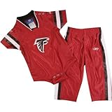 Too cute for a little boy. I highly recommend this item for anyone that's a Falcons fan and ready for some football!Great quality, haven't had the baby yet to see exactly how it fits, but looks to be expected size. Says "FALCONS" across the upper back, nice breathable mesh material. Highly recommend.